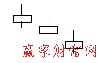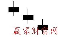 (九)三個黑小卒組合在高檔區(qū)出現(xiàn)這種連續(xù)三個黑小卒下跌的組合時,表示上升市勢已經(jīng)完結,下跌市勢已經(jīng)開始。