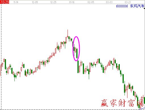 要點(diǎn):一、兩條陰線實(shí)體較長,通常都大于陽線實(shí)體長度。二、兩條陰線伴隨的成交量明顯大于陽線時的成交量。三、股價(jià)已攀升到一定高位。如下圖中600006東風(fēng)汽車在2007年10月31日到2008年6月24日的日k線圖,在2008年1月17號出現(xiàn)此形態(tài)后,同時大盤也是進(jìn)入下跌趨勢,之后股價(jià)一路下跌。