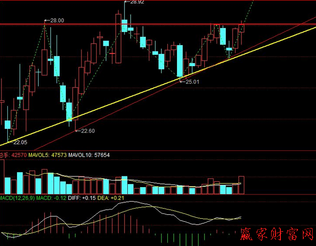 上升三角形通常在反彈高點(diǎn)的連線趨近于水平而回到連線的低點(diǎn),逐步墊高,因而形成往上傾的上升斜線,而在整理形態(tài)的末端,伴隨著攻擊量能的擴(kuò)增,一般往上突破的機(jī)會(huì)較大。價(jià)格在某水平呈現(xiàn)強(qiáng)大的賣壓,價(jià)格從低點(diǎn)回升到水平便告回落,但市場的購買力仍十分強(qiáng),價(jià)格未回落至上次低點(diǎn)便即時(shí)反彈,持續(xù)使價(jià)格隨著阻力線的波動(dòng)而日漸收窄。我們?nèi)舭衙恳粋€(gè)短期波動(dòng)高點(diǎn)連接起來,便可畫出一條阻力線;而每一個(gè)短期波動(dòng)低點(diǎn)則可相連出另一條向上傾斜的線,便形成上升三角形。