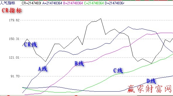 CR指標是能量指標的簡稱,一般是由五條曲線組成,其中波動最頻繁的是CR線,另外三條線波動相對緩慢些,分別是A線、B線、C線和D線。如下圖所示: