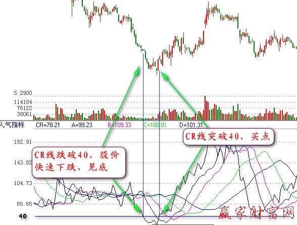 第一種買入方法:CR線在40以下,當CR線向上突破40時買入股票