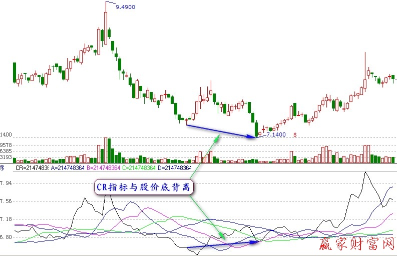 當股價持續(xù)下跌、連續(xù)創(chuàng)出新低時,如果CR指標的CR線沒有創(chuàng)新低,反而是形成一底比一底高的形態(tài),這就與股價形成了底背離。