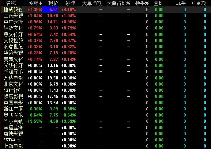金逸影視一度觸及漲停,收盤漲幅4.45%;上海電影也是一度漲超8%,收盤漲幅5.42%;除此之外,唐德影視漲停;*st當(dāng)代漲停;影視行業(yè)龍頭華誼兄弟也上漲了3.07%;中國電影享有進(jìn)口影片引進(jìn)權(quán),上漲了2.29%;而萬達(dá)電影作為我國最大的院線公司上漲了2.13%。