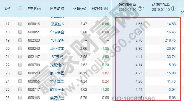 通常提到的市盈率為靜態(tài)市盈率,以目前的市場價格比上已經(jīng)公布的每股收益后一直,在一段時間內(nèi)是不變的,通俗的意義表示一個企業(yè)要花費多長的時間才能收回自己的成本,這個值處于10-20年之間都比較正常,時間越長說明公司花費時間越長。動態(tài)市盈率則是用靜態(tài)市盈率比上下一年年度利潤增長率。靜態(tài)市盈率表示代表的是過去時間內(nèi)公司的估值,而動態(tài)市盈率則是對于未來的一種預(yù)測。在具體使用的時候,不能說那個好,那個不好,可以結(jié)合使用,動態(tài)市盈率上漲高于靜態(tài)市盈率說明公司業(yè)績正在走壞;相反則是公司正在上漲走勢。另外就是觀察動態(tài)市盈率的持續(xù)性,長期低于靜態(tài)市盈率則是公司處于冉冉升起的狀態(tài)。因此除了對于動態(tài)市盈率的排名查詢之外,還需要兩者對比,這個可以在同花順問財上得到結(jié)解決,如下圖所示。