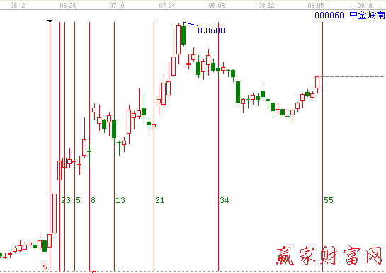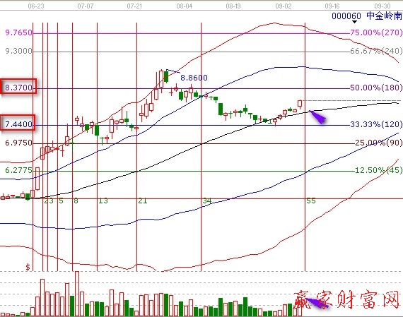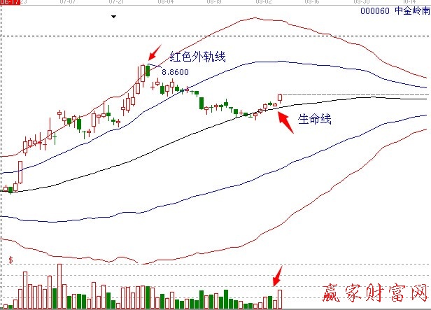 對(duì)于中金南嶺(000060)這只股票,是在2014年8月6日的時(shí)候有個(gè)朋友問我,他說看看這只股票如何。之后我問他是在什么位置進(jìn)入的這支股票,他告訴我是在7月29日最高價(jià)的時(shí)候進(jìn)入的。這只股票在那一天創(chuàng)了新高,股票位置已經(jīng)處于高位,風(fēng)險(xiǎn)很大。我們可以通過極反通道來看一下位置。這位置已經(jīng)是到了紅色外軌線的壓力位置。