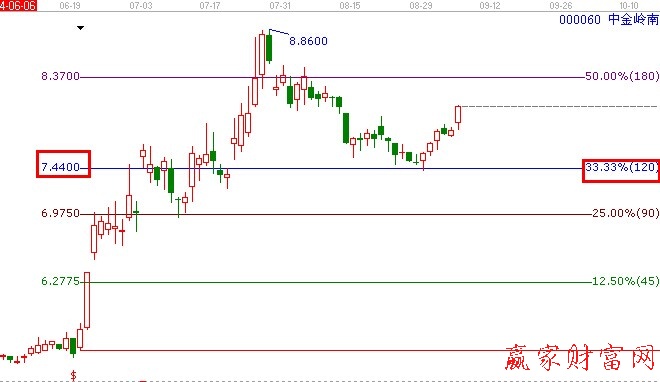 江恩價(jià)格百分比來看,出現(xiàn)補(bǔ)倉的價(jià)格比之要低。在江恩百分比120度位置7.44位置止跌出現(xiàn)支撐位置。這個(gè)是三分位,是一個(gè)比較重要的支撐位置。