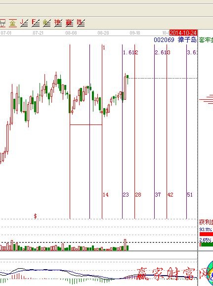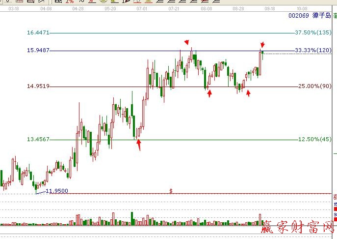 如圖所示,該圖是股票002069的價格分析圖,所用工具是江恩價格百分比。我們說,股價在百分比上的看法可以很形象的比作是上樓梯和下樓梯。上了一個臺階,再上另一個臺階,在圖中就是站穩(wěn)了一條線,在往上看一條線。比如,站穩(wěn)了25%的位置,目標(biāo)就看到33.33%的位置。同樣的,下樓的時候一個臺階一個臺階往下走。股價也是一樣的,一條線過不去了,就要往下看一線。在圖中,我們可以看出,股價從12.5%的位置獲得支撐,就一路向上,站穩(wěn)25.%的位置之后繼續(xù)向上,在33.33的位置沒有有效突破向下回踩了。獲得支撐,再次看到33.33%的位置了,目前該股在33.33%的位置兩天了都沒有突破,這時,投資者是注意風(fēng)險的,如果是穩(wěn)健的操作者,可以考慮減倉保護既得利潤,等突破可以加倉或者回踩到14.95元附近也可以加倉。