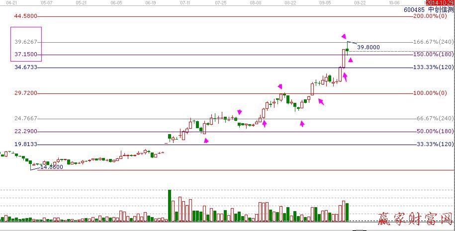 如下圖所示,該股600485選用江恩價(jià)格百分比進(jìn)行價(jià)格分析。選擇14.86元這個(gè)低點(diǎn)為起點(diǎn),進(jìn)行百分比分割。其中,33.33%,50%,66.67%這三個(gè)位置是比較重要的支撐阻力。從圖中可以看出,目前166.67%位置的價(jià)格沒(méi)有很好的突破,回踩150%重要支撐,該位置不破,股價(jià)還是會(huì)上去的。同時(shí),投資者可以根據(jù)比百分比做好差價(jià)操作,使利潤(rùn)最大化。