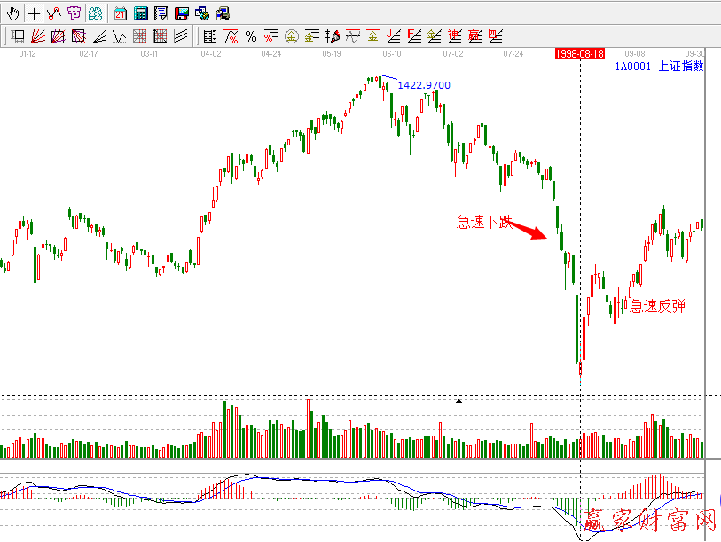 在下跌的最后階段,從1998.08.06----1998.08.18,幾天之間下跌了250點,這個下跌的速率大大超過了市場正常的運動規(guī)律,所以必然需要被市場休正,