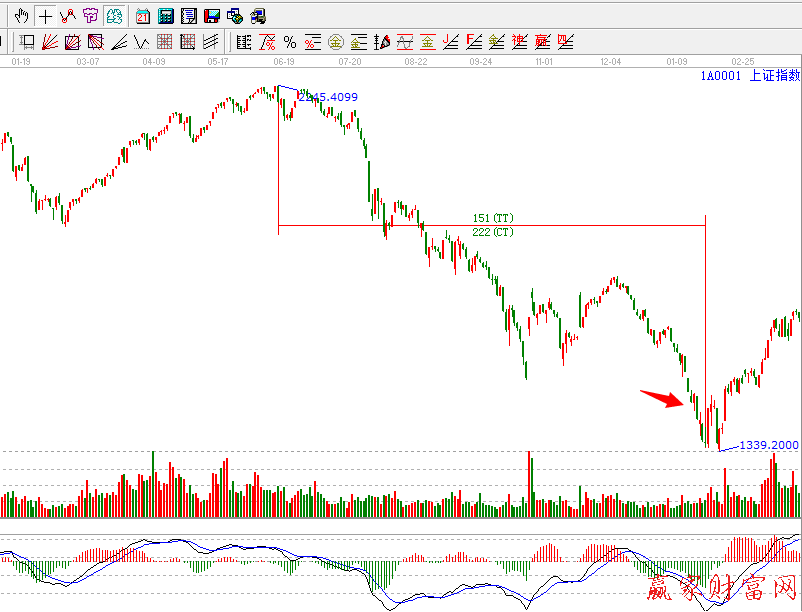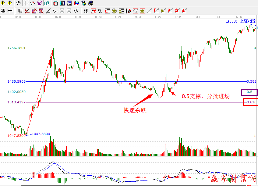 例圖2,1999點的12月底,上證指數(shù)已經(jīng)跌到前期波段(1999.05.17----1999.06.30)的50%位置,在跌破50%出現(xiàn)了急速的下跌波動,在接近0.382位置附近出現(xiàn)了快速的折返運動,量能迅速放大,快速反彈,隨后在50%位置得到有效支撐,依據(jù)規(guī)則投資者可以分批進(jìn)場。
