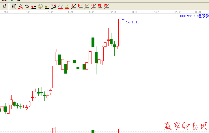 江恩理論從時間、價格、趨勢三方面來解析個股,那么首先我們看000758的趨勢,在1月5日的收盤價為16.16,創(chuàng)出了近期的新高,說明個股趨勢是向上的,而在江恩理論中針對這樣的個股能不能買進,是不是符合斷骨的條件也給出了明確的答復,在江恩買賣十二法則中的第九條就是這樣說的:當出現高低點或是新高時買入。