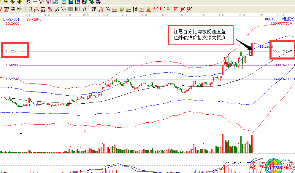極反通道,我們也可以看到股價在2015年1月5日以漲停的形式突破了藍色外軌線位置,極反通道的藍色外軌線也對股價形成了支撐。所以在價格上,000758符合我們的選股條件。