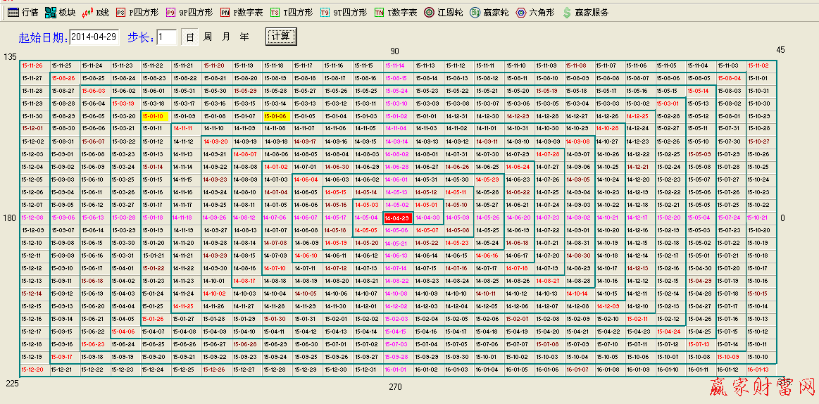 江恩四方中,我們以2014年4月29日為起點,可以看到在1月6日和10日分別為重要的時間窗口,也就是說個股在6日和10日的時候有可能發(fā)生趨勢的轉變,很可能就是一波拉升和結束的時間窗口。從時間上有臨近的時間窗口,也符合我們的選股條件。