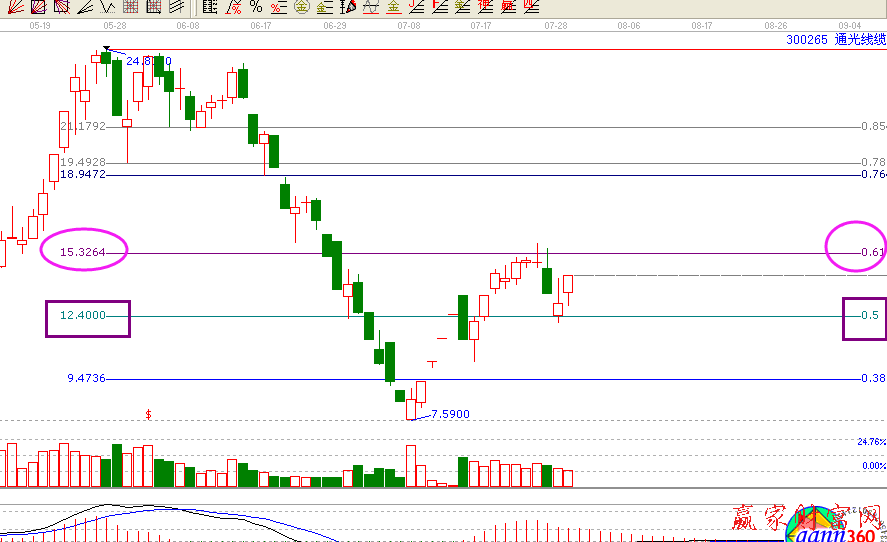 上面圖中我們選擇高點(diǎn)24.80為起點(diǎn)位置,做點(diǎn)位的分割,我們可以看到重要的反彈終止位置和回踩止跌位置都在黃金分割線上,發(fā)生了趨勢(shì)的反轉(zhuǎn)。如果選擇的是低點(diǎn),也是同樣的使用方法。