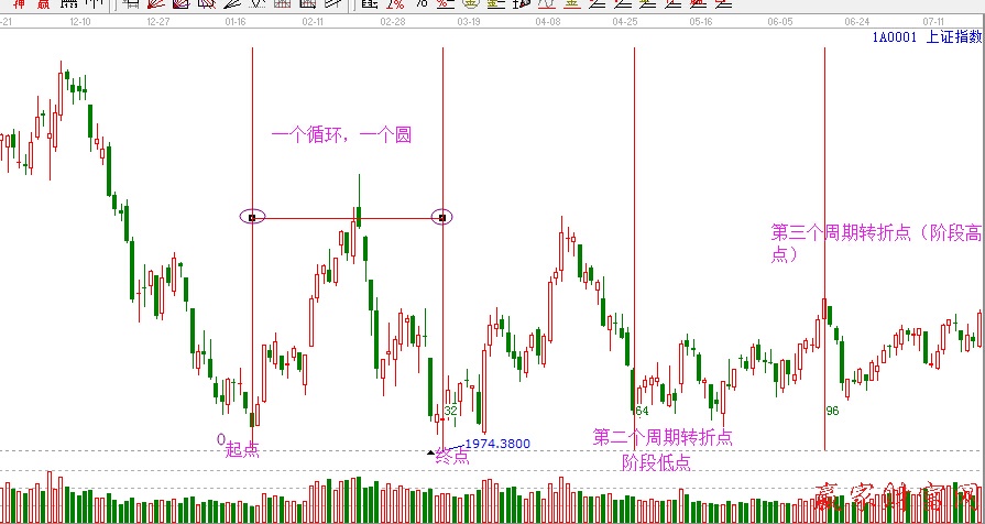 人一生的六個(gè)周期來看,組成了一個(gè)循環(huán)、一個(gè)圓,股市中、人生中,到處都是圓的世界。江恩的圓,是教我們?nèi)绾瓮顿Y, 而禪師對(duì)圓的的妙論,則是向我們闡述人生的哲理和命運(yùn)的歸宿。按照規(guī)律做事你就是神,就是順勢(shì),通過這篇文章大家可以對(duì)人生有了一個(gè)圓的理解,那么江恩提到的金融市場(chǎng)的圓該如何解釋呢,請(qǐng)看下圖,一個(gè)完整的波段,2014年1月20日——2014年3月12日是一個(gè)上升回落的循環(huán),可以理解為一個(gè)圓,一個(gè)周期循環(huán),那么這個(gè)循環(huán)對(duì)于未來走勢(shì)有什么作用呢,請(qǐng)看,后期的第二個(gè)周期,第三個(gè)周期節(jié)點(diǎn),都是一個(gè)重要的轉(zhuǎn)折點(diǎn)。這就是歷史的復(fù)制,研究歷史預(yù)測(cè)未來,陽(yáng)光之下無新鮮事。