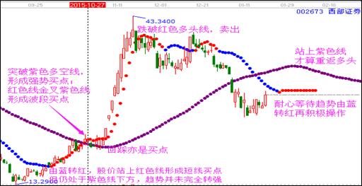 ?。ǘ┭邪l(fā)原理:江恩認(rèn)為判斷并跟隨市場的趨勢是首要的,最安全的買點(diǎn)即在趨勢中確定的變化建立后再買股票。通過對指數(shù)及個股歷史數(shù)據(jù)的統(tǒng)計(jì)分析,用3種顏色的趨勢線來判斷市場的多空方向。該工具由紫色多空線、紅色多頭線和藍(lán)色空頭線構(gòu)成,投資者可以通過K線所對應(yīng)的趨勢線顏色及相應(yīng)的位置來判斷買賣點(diǎn)。