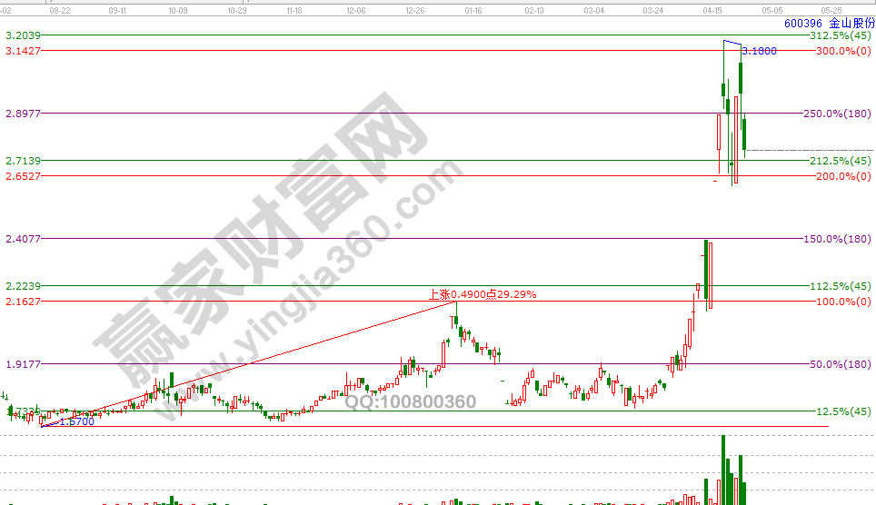 第四步:繪制江恩角度線。按照角度線制作規(guī)則,計算波動率,選擇歷史重要高點或是低點為起點完成作圖,判斷未來趨勢強弱以及漲跌空間與重要點位。