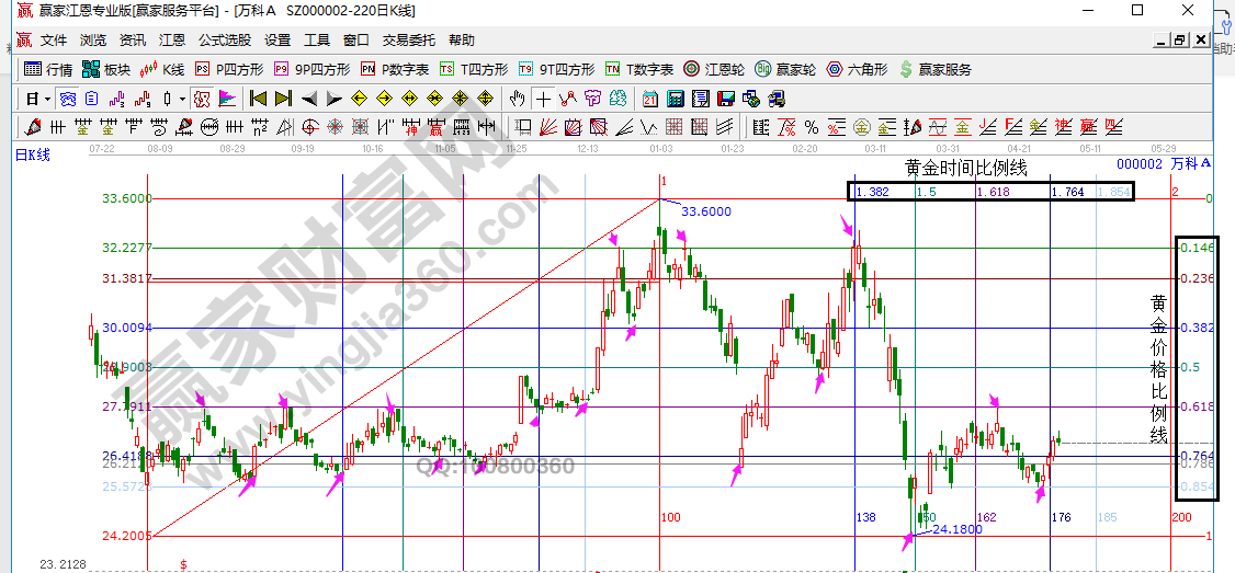 接著,自然法則是如何來影響股市的?這個(gè)無形的語言或者密碼是什么?簡(jiǎn)單來說就是數(shù)學(xué),數(shù)學(xué)是自然科學(xué)的語言!在市場(chǎng)中隨處可見的黃金比例,平時(shí)分析所用的圖形、劃線等都是基于數(shù)學(xué)構(gòu)建的分析模型,借助這些數(shù)學(xué)模型,我們可以在看似無序的K線中,快速找到有序的交易信號(hào)。來一張萬科A的分析圖,雜亂的K線圖中,加上一組黃金時(shí)間比例線和黃金價(jià)格比率線,走勢(shì)中關(guān)鍵的頂部和底部位置就規(guī)規(guī)矩矩的擺在那里。當(dāng)前是處于支撐角度該買入持有,還是該高拋兌現(xiàn),清清楚楚!
