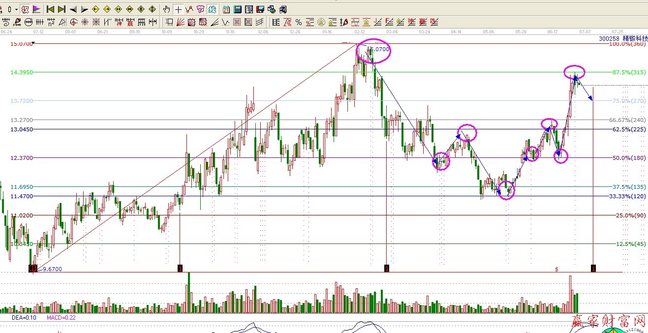 首先我們以2013年7月9號的低點9.67——2014年2月10號的高點15.07為波段畫