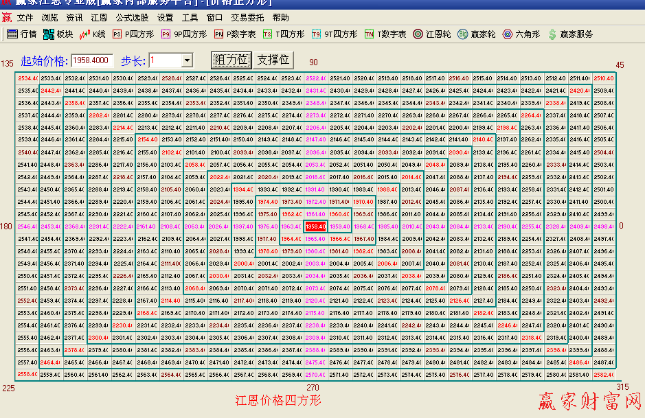 價格預測分析體系包括:江恩價格四方型、江恩九格四方型、江恩價格四方形數(shù)字表、江恩價格百分比、江恩價格回調(diào)帶、江恩價格循環(huán)線等。