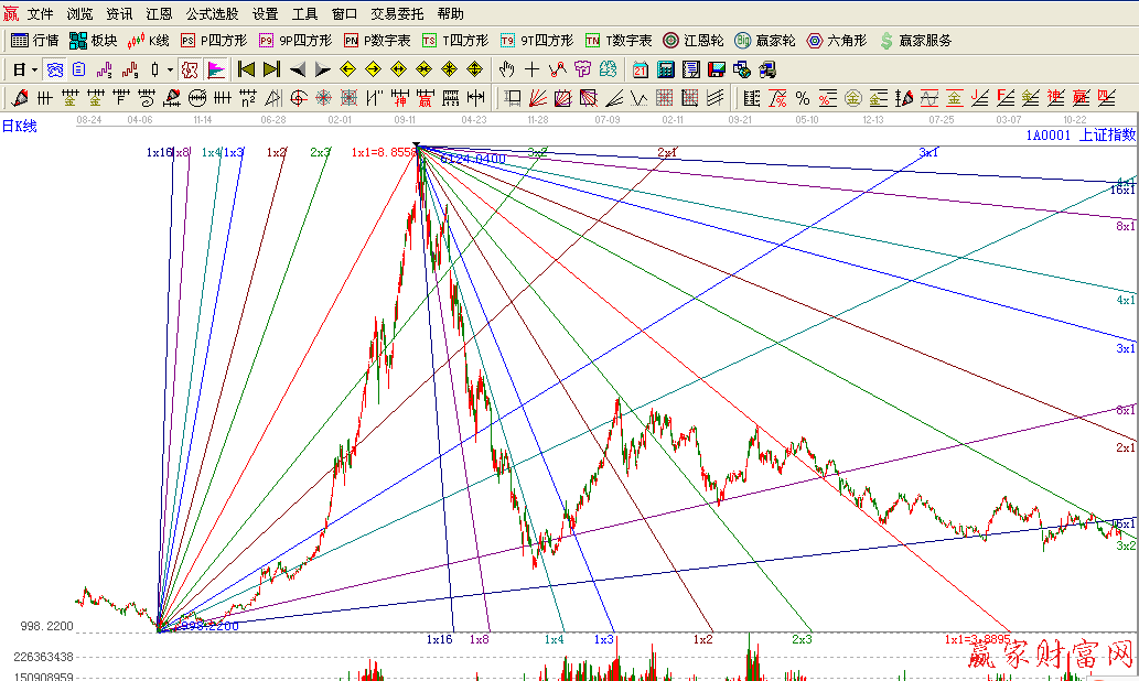 45角度線(1X1角度線)是最關鍵的射線。在角度線的使用中,時間價格的起始點定位非常關鍵,一旦定位錯誤,角度線將失去意義。江恩講過,研究市場的歷史走勢從而可以預測市場未來的走勢,怎樣研究歷史走勢呢?我認為首先要研究市場的歷史高點低點的價格和時間。所以一般情況下,可以用歷史的高點或低點做為角度線的起始點。注意在這里提示大家,單純的上升角度線或單純的下降角度線是不能起到預測時間價格功能的。注:只有兩者配合使用才能起到準確預測時間和價格的作用,單純的上升或下降角度線只能起到分析趨勢的功能。