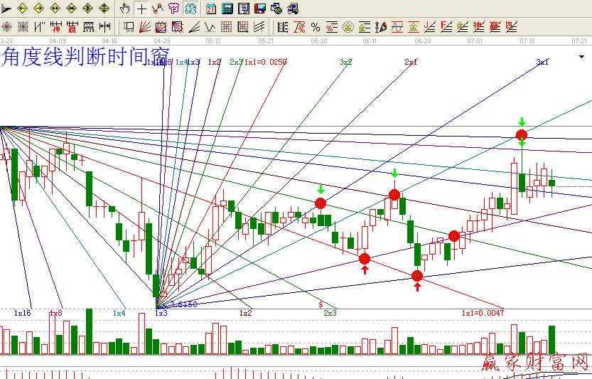 在K線圖中,選取最高點和最低點可以依次畫出下降和上升兩組江恩角度線。這兩組江恩角度線互相交叉,不僅可以確定市場將在什么時間發(fā)送反轉,還可以預測出市場反正將到什么價位,構成時間與價格的美妙和諧。