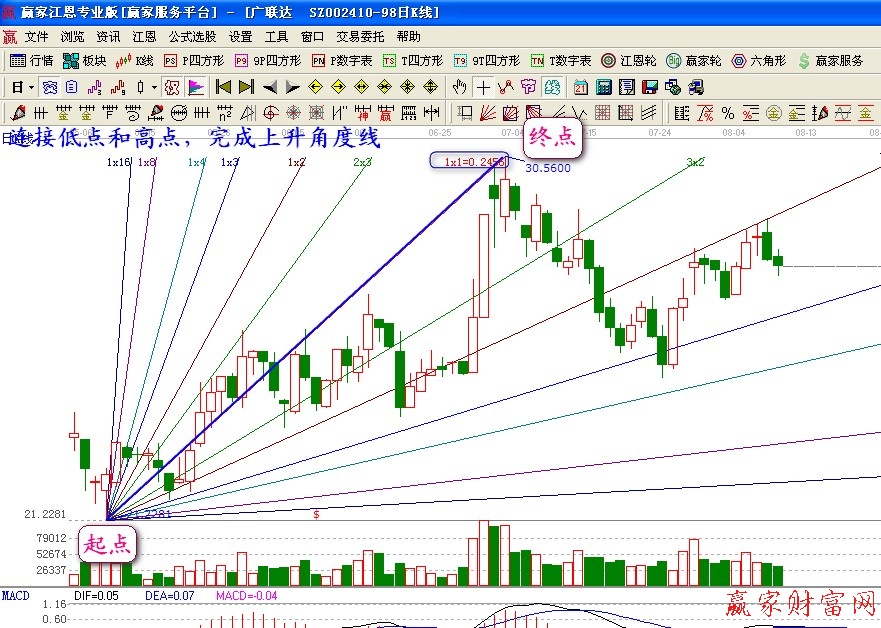 江恩角度線);2、江恩網(wǎng)絡(luò);3、江恩箱。今天我們主要講一下江恩角度線的畫法。江恩角度線是時(shí)間、價(jià)格和幾何角度的綜合體。通過各種角度,交叉時(shí)間和價(jià)格的使用,能得到各種買賣信號(hào)。