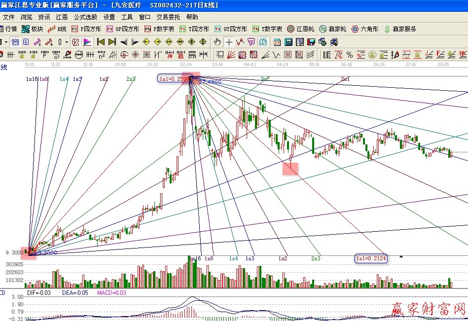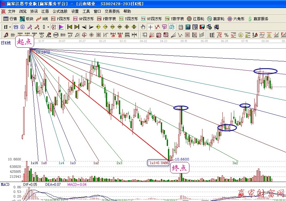 2、市場經(jīng)過多次突破之后,最后會(huì)在某一條角度線終止現(xiàn)有趨勢,并發(fā)起新一輪與之前相反的趨勢。
