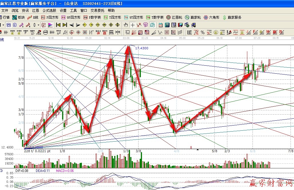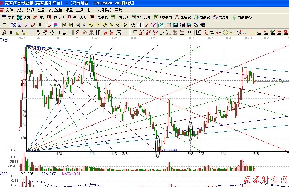 通過這兩個(gè),我想大家也明白了,江恩箱沒有一個(gè)明確的畫法。也不會(huì)像趨勢線、黃金分割那樣有一個(gè)固定的模式讓你去套用。江恩箱是非常靈活的一種畫線工具。需要股友們長期的實(shí)踐和測試,還需要多觀察多修正,這樣才能畫出一副完美的江恩箱。