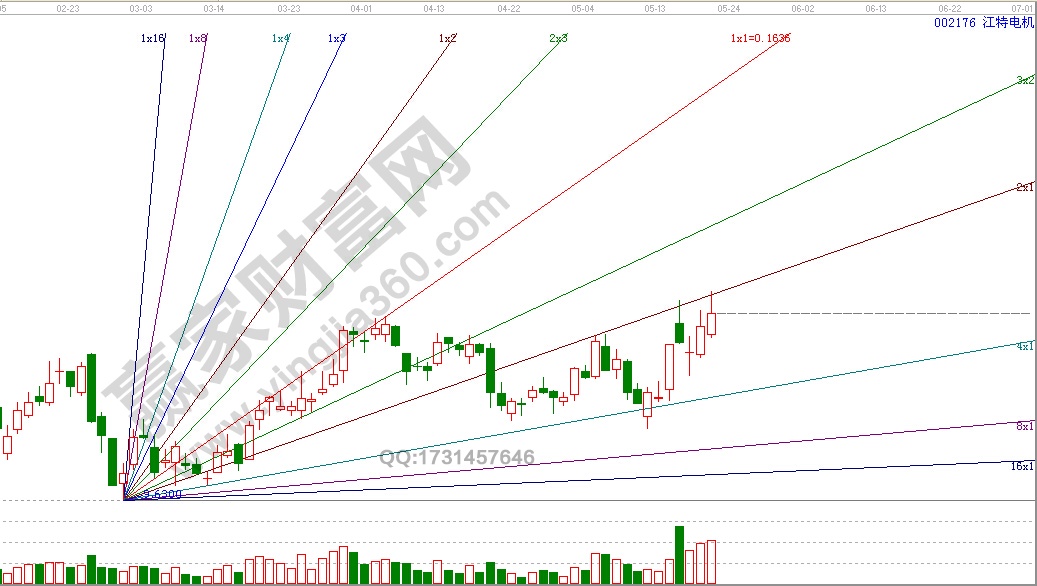 我曾經(jīng)多次提到結(jié)構(gòu)一詞,這正是研究江恩理論需要重點解決的問題,我們在讀江恩理論的書籍時候,尤其是初次接觸,他的那些個理論,模型,圖形,讓人感覺摸不著頭腦,更不用說在股票的k線分析上結(jié)合使用了。其實江恩理論里面的最重要的一個概念是結(jié)構(gòu),理解了結(jié)構(gòu)你對江恩理論才能豁然開朗,當然這些個結(jié)構(gòu)絕對不是雜亂無章的,結(jié)構(gòu)是時間和價格的函數(shù),結(jié)構(gòu)有時間的結(jié)構(gòu),價格的結(jié)構(gòu),時價的結(jié)構(gòu),也可以說是趨勢的結(jié)構(gòu)。我認為江恩理論里面最典型的角度線分析工具,就是分析趨勢結(jié)構(gòu)的,什么是趨勢,我們先看看物理學上力的表示:大小方向作用點,在角度線工具里面,也有這三個要素,他們可以說是一模一樣的,我們在市場上習慣用趨勢這個詞,但是趨勢究竟是什么,其實趨勢首先包含了方向,其次是大小,也就是力度,還有趨勢的轉(zhuǎn)折點,趨勢既然包含了方向和大小,那么就和物理學上的力的分解一樣,分解的結(jié)果就是水平方向上一個垂直方向上一個,正應了江恩所說的那句話:時間和價格相互轉(zhuǎn)換,趨勢不是價格也不是時間,趨勢卻包含了價格也包含了時間,對趨勢進行分析的工具就是角度線,所以角度線就是趨勢2(3)分法的應用,這就是角度線能夠描述市場的本質(zhì)所在。