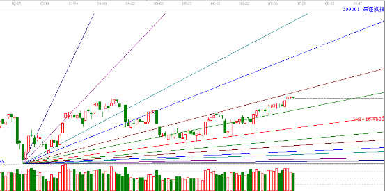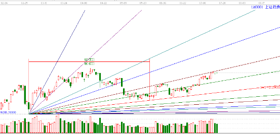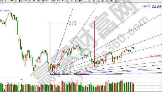 選擇一段趨勢,計算出這段時間的波動率,以創(chuàng)業(yè)板指為例,在圖中選取2016年3月1日1841點和2016年5月12日1975點,相距51天,上升波動率2.62,這是一個短期的波動率,它代表的含義是,時間上畫一個方格,價格上畫2.62個方格,可以繪制出一個原汁原味的江恩角度線。