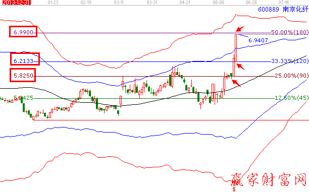 上圖中加有極反通道,可以看出首先此股票在生命線上,屬于強勢股票,可以操作。之后根據百分比找買點,當然最安全的買點還是生命線位置;之后我們可以看出,在6月13日股票后來就回回調支撐,就是逢低買的買點,之后第二天獲得支撐就有一個快速的拉升,并突破上方壓力6.2133,以此為支撐繼續(xù)向上拉升。至于之后的走勢就要提高止損位至藍色外軌線支撐,而壓力位就是上方壓力6.99。