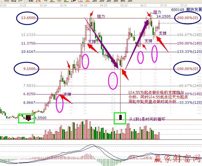 江恩價格百分比圖,在圖中我們可以看出價格的支撐阻力?,F(xiàn)在重點(diǎn)說下100%的位置和200%的位置(看圖中看到有括號里有120、180、0這是度數(shù))。也就是從0度到0度是一個循環(huán)。股價從9.1開始獲得0度位置的支撐開始上漲,漲到200%的位置遇到阻力,正好是一個循環(huán),然后開始下跌,正好跌到100%的位置,也是起始的位置,然后又開始一波新的上漲。正好配合時間,時間也循環(huán)了一倍的位置,時間價格都到了,股票不漲都難。一波上漲,一波回調(diào),在一波新的上漲,然后同樣到200%的位置13.65元開始有回調(diào)。這次沒有按照前面1:1的比例走,而是回調(diào)到三分之一的位置獲得支撐向上了,現(xiàn)在同樣需要注意13.65的阻力,如果不能突破向上,還是要向下回踩的。