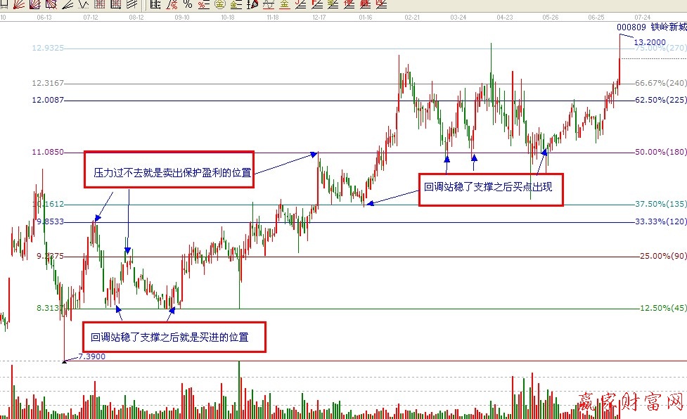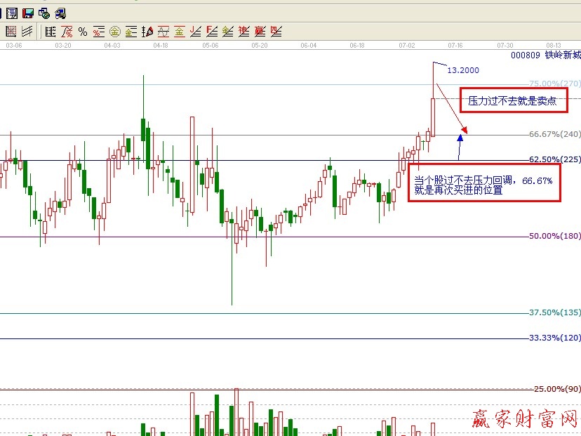 在看下面第二個(gè)圖,我們可以分析個(gè)股現(xiàn)狀,目前個(gè)股剛好運(yùn)行至壓力位置,后市如果不能有效突破,則就是獲利出局的時(shí)候,而一旦股價(jià)回調(diào),下一個(gè)賣點(diǎn)就會(huì)在66.67%附近,這樣我們就提前分析個(gè)股未來能運(yùn)行到的股價(jià),從而提前做好交易計(jì)劃,應(yīng)對(duì)市場(chǎng)的變化,隨時(shí)跟上市場(chǎng)的節(jié)奏。