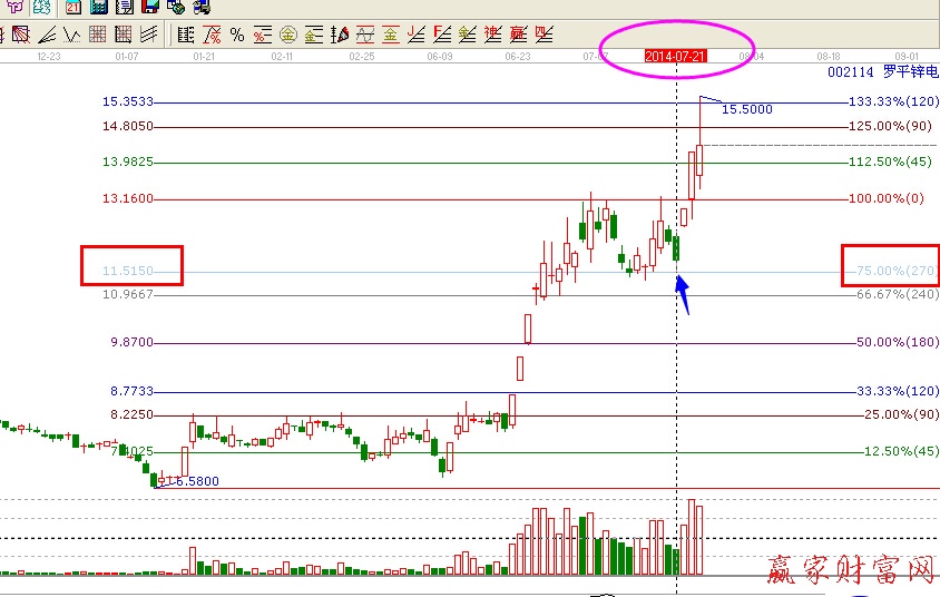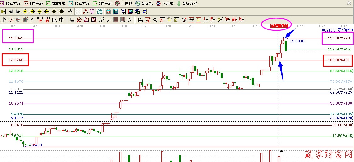 那么在市場(chǎng)中有做差價(jià)的好方法嗎?答案是有,江恩的百分比在尋找買點(diǎn)和把握一天波動(dòng)做差價(jià)方面有著出奇的效果。下面我們以002114為案例,展示其在實(shí)戰(zhàn)中的效果。