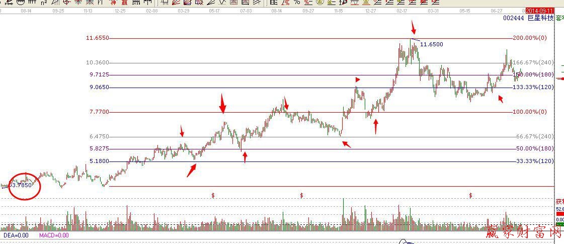 我們就是要研究歷史,來把握未來走勢的,通過歷史上已知的數(shù)據(jù),來預測后市。如果歷史上的數(shù)據(jù)分析出來是正確的,那么,未來也是對的,所以,在用百分比的時候,要格外的注意一下選點。要選擇重要的高點或低點,作為起點,來做判斷。上面講述了該股的第一目標,以及止損位的設置,如果還有哪里不清楚的,可以聯(lián)系客服。