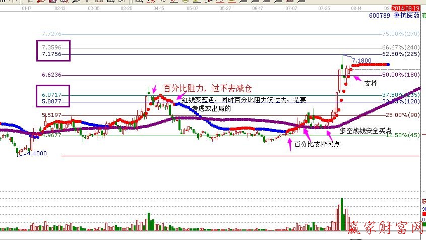 首選,選點(diǎn)。在用百分比的時(shí)候,選點(diǎn)很重要。我們需要選擇一個(gè)歷史上的高點(diǎn)或低點(diǎn),來(lái)預(yù)測(cè)未來(lái)的支撐阻力。對(duì)于600789這只個(gè)股我選擇4.4元這個(gè)低點(diǎn)為起點(diǎn)作圖分析。作為投資者都知道,買(mǎi)在支撐位上比買(mǎi)在阻力線(xiàn)下安全,也就是說(shuō)股票有支撐的話(huà),是可以考慮買(mǎi)入的。從圖中可以看出在4.96元附近是有百分比45度位置的支撐的,如果想要介入的話(huà)是可以適當(dāng)建倉(cāng)的。站穩(wěn)一線(xiàn),看高一線(xiàn),如果在4.96元附近介入了該股,那么第一目標(biāo)就是90度位置價(jià)格是5.51元附近。后面的計(jì)劃可以再根據(jù)盤(pán)面計(jì)劃做調(diào)整。