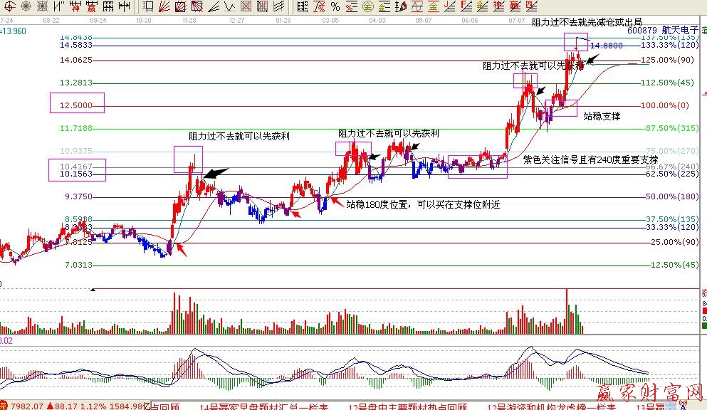 江恩價格百分比看一下價格的支撐阻力然后結合乾坤k線作出劍氣交易計劃。江恩價格百分比是一個單點的工具,只需要一個歷史上重要的高點或低點就可以。在該股中選擇6.25元這個低點為起點作圖??梢钥闯鲈谥匾陌俜直任恢帽热?0度,180度,0度以及120度位置上股價都起到重要的支撐或阻力的作用(在圖中有用文字標注)