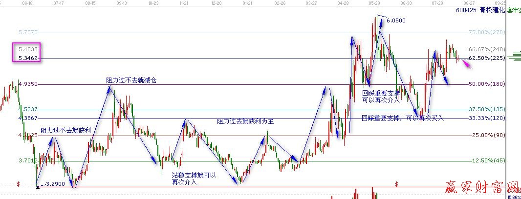 所用工具江恩價格百分比,以3.29元這個低點為起點作圖如下。從圖中可以看出每次回調(diào)到重要點位都在江恩百分比的重要分割位上,每當股價下跌至這些位置比如45度位置,90度位置,180度位置甚至還有起點的位置不在創(chuàng)新低開始一波上漲,在這些重要位置站穩(wěn)就形成新的買點。站穩(wěn)一線,看高一線,當股價運行至阻力位時往往都是一波短期拉升的終結(jié)點,也就是賣點。這個時候是需要關注