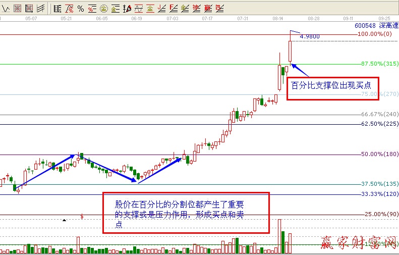 江恩理論就是研究歷史預(yù)測未來,江恩認(rèn)為過去的重要的點位對未來的股價都是有著重要的作用的,江恩百分比就是其中的一種價格分割關(guān)系。首先我們以2013年7月9號的低點2.47為起點畫江恩百分比,我們可以看到在2014年8月19日股價剛好在百分比的87.50%的位置獲得支撐,形成了買點,同時我們也可以發(fā)現(xiàn),在前面股價也在百分比的分割位受到壓力或是支撐,形成了賣點或是買點。