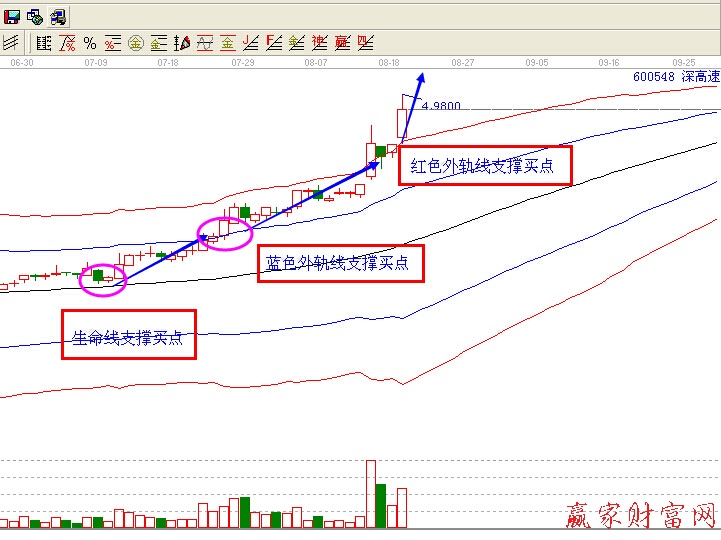 極反通道,我們可以看到極反通道每條線都可以是個股的支撐或是壓力,也就是買點和賣點,當(dāng)前我們可以看到股價在2014年8月19日剛好是在極反通道紅色外軌線獲得支撐,形成買點。