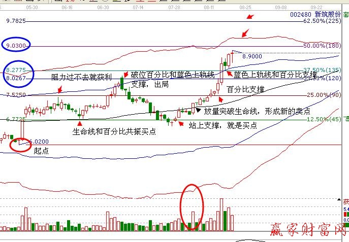 在這波上漲中,6.77元附近哪里也就是百分比45度位置那里是一個好的買點,另外一個安全的買點就是生命線那里,通過圖可以發(fā)現(xiàn),成交量放大突破生命線,形成買點。站穩(wěn)一線,看高一線,這樣你就可以根據(jù)圖形來做計劃了。