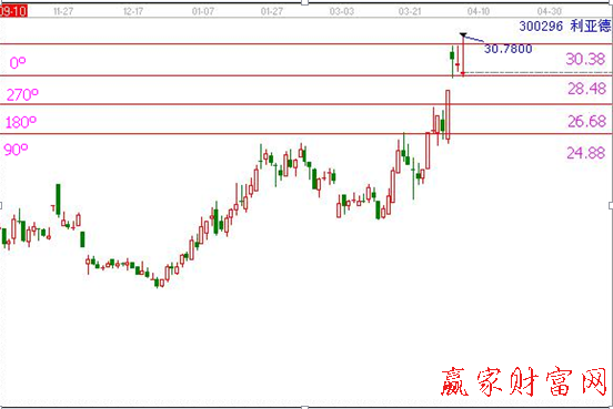 當(dāng)然我們要明白,阻力支撐是相對(duì)而言,阻力突破就是支撐。我們選擇支撐位,我選擇五個(gè)最接近此股票為90度支撐24.88、180度支撐26.68、270度支撐28.486、0度支撐位30.386。如下圖: