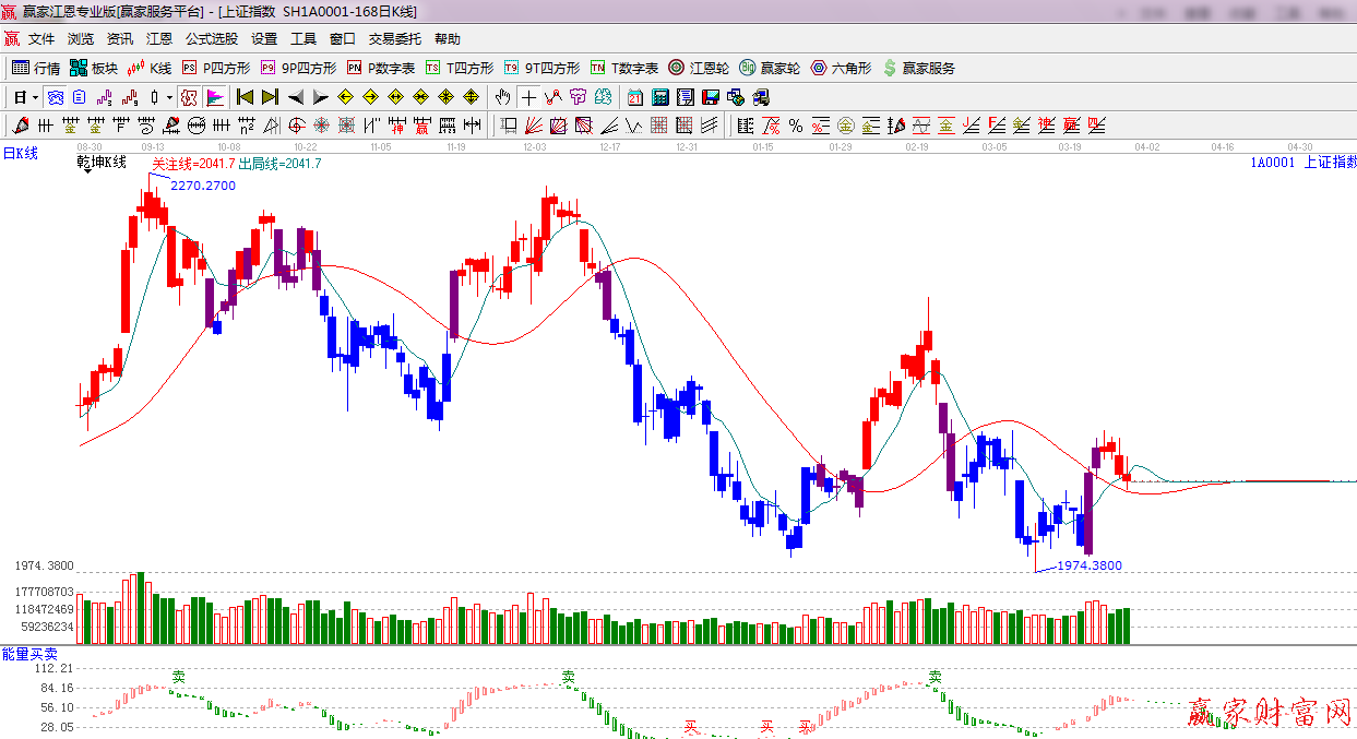 ★依據(jù)贏家江恩系統(tǒng)乾坤K線提示: 大盤處于紅色可操作區(qū)域,回踩紅色關(guān)注線,此線不破,波段看多。
