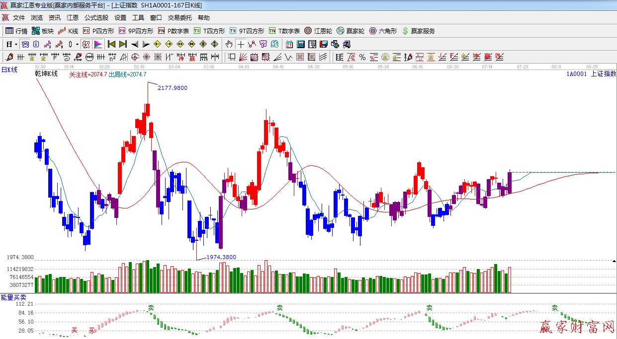 ★依據(jù)贏家江恩系統(tǒng)乾坤K線提示: 關(guān)注線位置拉起中陽線,紫色k線,警示信號,謹慎為主。