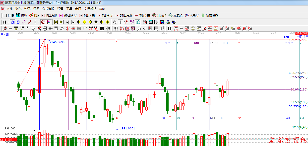 江恩看盤綜述:依據(jù)贏家江恩技術(shù)工具分析得出:周二指數(shù)低開高走,放量突破2060點阻力,指數(shù)下一目標位是2082-2089區(qū)間,是預(yù)計短期指數(shù)以高位震蕩為主,日線下一時間窗口是7月28日。操作上,繼續(xù)關(guān)注低位藍籌股以及受益微刺激的高鐵、核電、特高壓、新能源等概念。