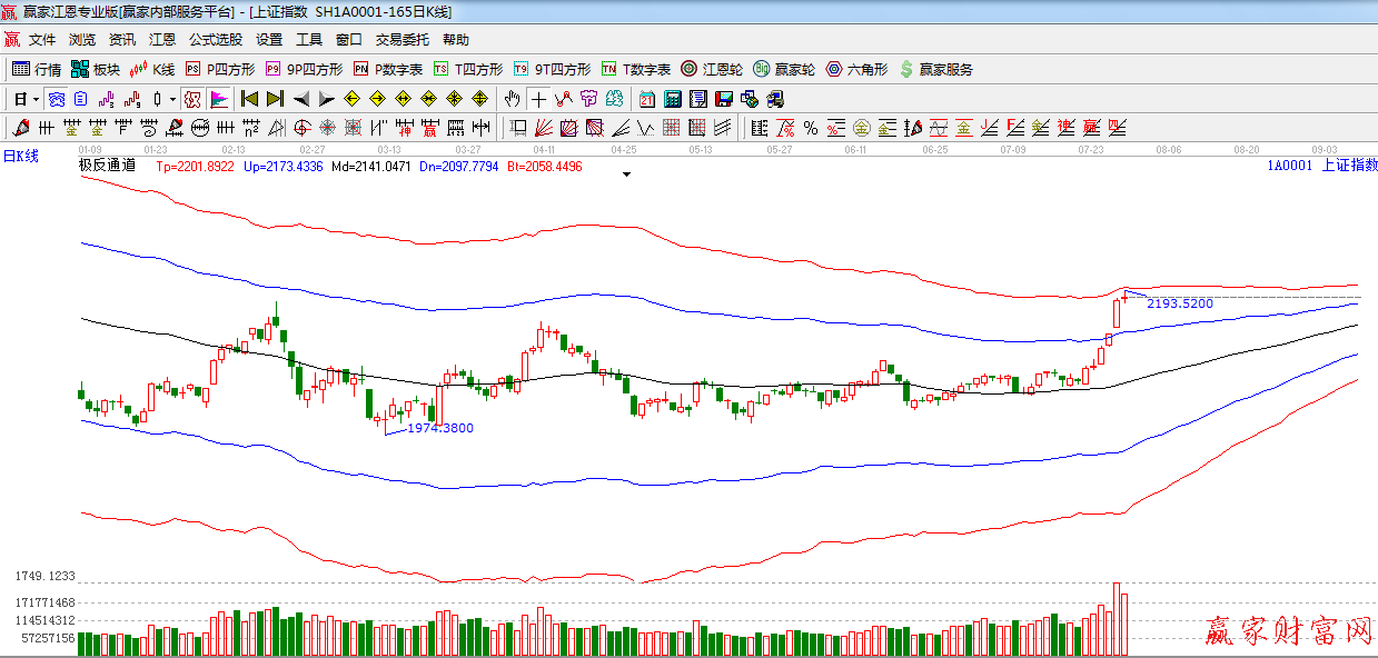 盤面上,個股板塊漲多跌少,航天軍工,國產(chǎn)軟件,鋰電池,倉儲物流等板塊表現(xiàn)活躍,藍籌股出現(xiàn)分化,鋼鐵、有色、煤炭等出現(xiàn)不同程度的回調(diào),只有房地產(chǎn)和券商板塊上漲,今日題材股表現(xiàn)好于權(quán)重股,指數(shù)上攻動能在衰減,而且指數(shù)也逼近極反通道紅色外軌阻力線附近,預(yù)計短期大盤將沖高回落。