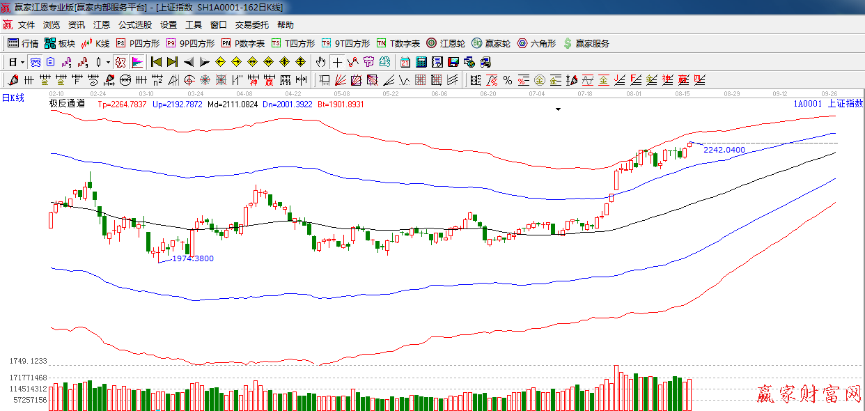 極反通道提示:創(chuàng)出近期新高,極反通道紅色外軌阻力是 2260附近。