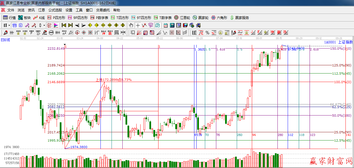 江恩看盤綜述:依據(jù)贏家江恩技術(shù)工具分析得出:指數(shù)高開,突破180度2232點(diǎn),創(chuàng)出近期新高,題材股活躍,權(quán)重股滯漲,接近2254,2261點(diǎn),拋壓會(huì)越來越重,預(yù)計(jì) 周二大盤繼續(xù)高位震蕩。
