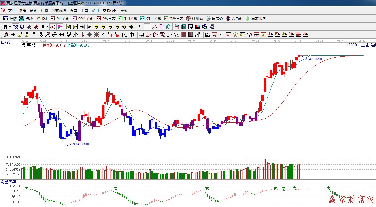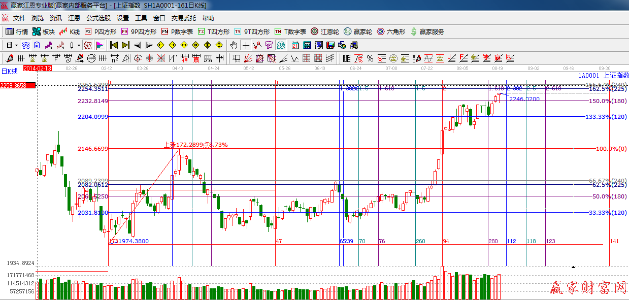 ★依據(jù)贏家江恩系統(tǒng)波段百分比提示:盤中回踩180度支撐線,進一步逼近 225度是2254點,240度2261點。